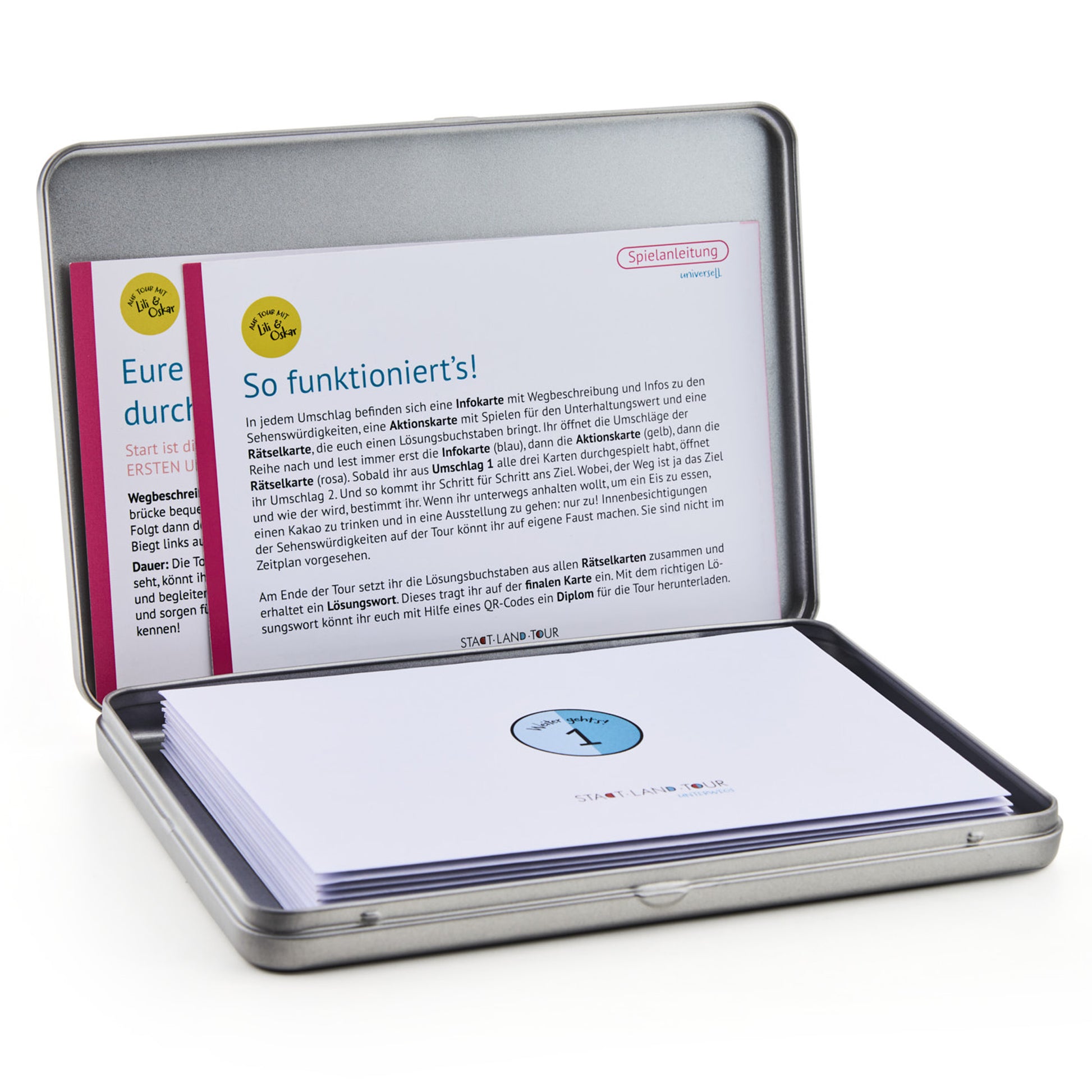 Wir verschicken eure Schnitzeljagd in einer praktischen Metallbox (Maße: 190 x 135 x 18 mm). Das sorgt nicht nur dafür, dass eure Karten trocken bleiben, wenn ihr unterwegs in Regen kommt, sondern bietet auch die stabilste Lösung. Um es noch nachhaltiger zu machen, empfehlen wir euch, die Box für eine Zweit- und Drittverwendung zu nutzen. Zum Beispiel als Stiftebox für unterwegs, als Erste-Hilfe-Box mit Pflaster füllen, als Memorybox, in der ihr Erinnerungen wie Fotos, Postkarten und Notizen aufhebt. Oder als Box für Briefmarken.